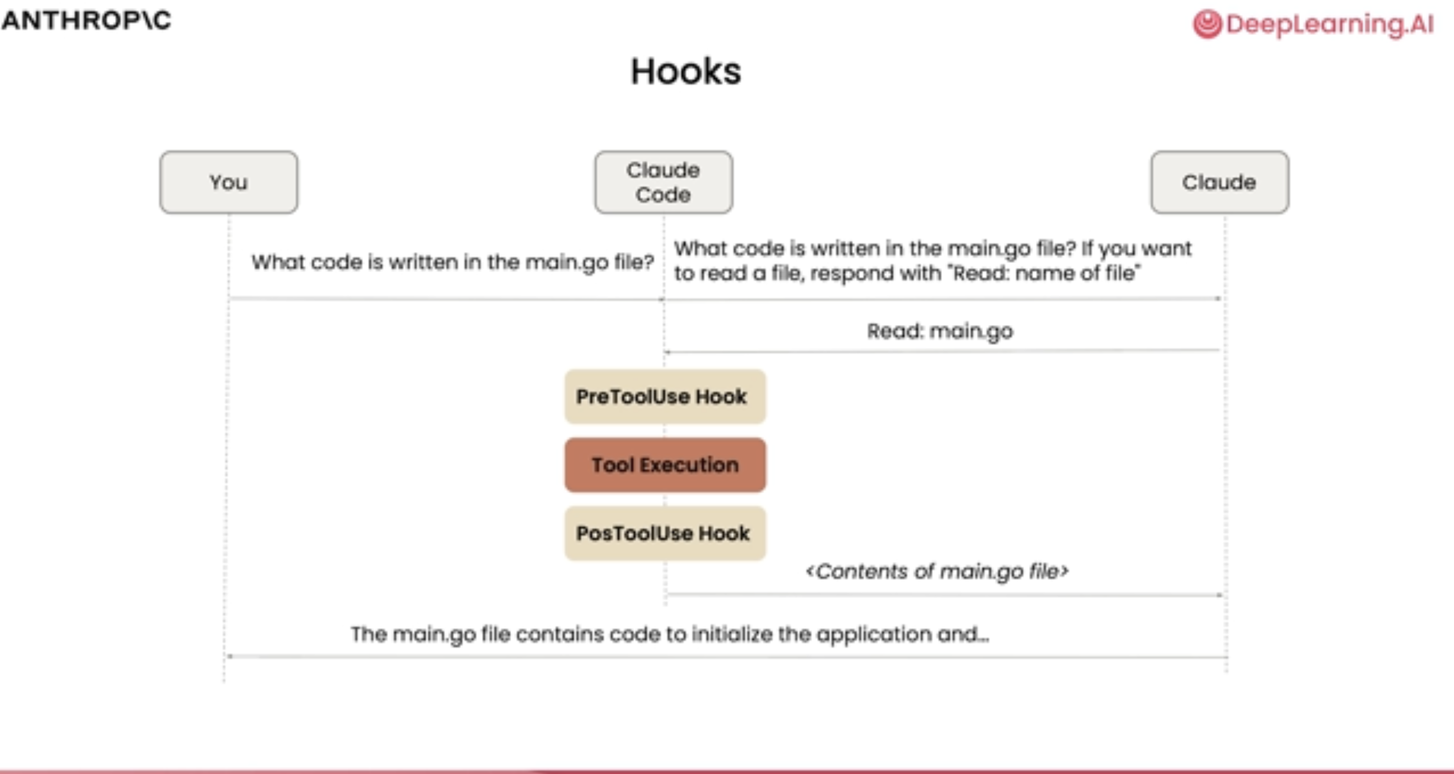 - We can inject our own script to run at any point in the life cycle of Claude Codes operation (Like something after a tool or before a tool call etc.)